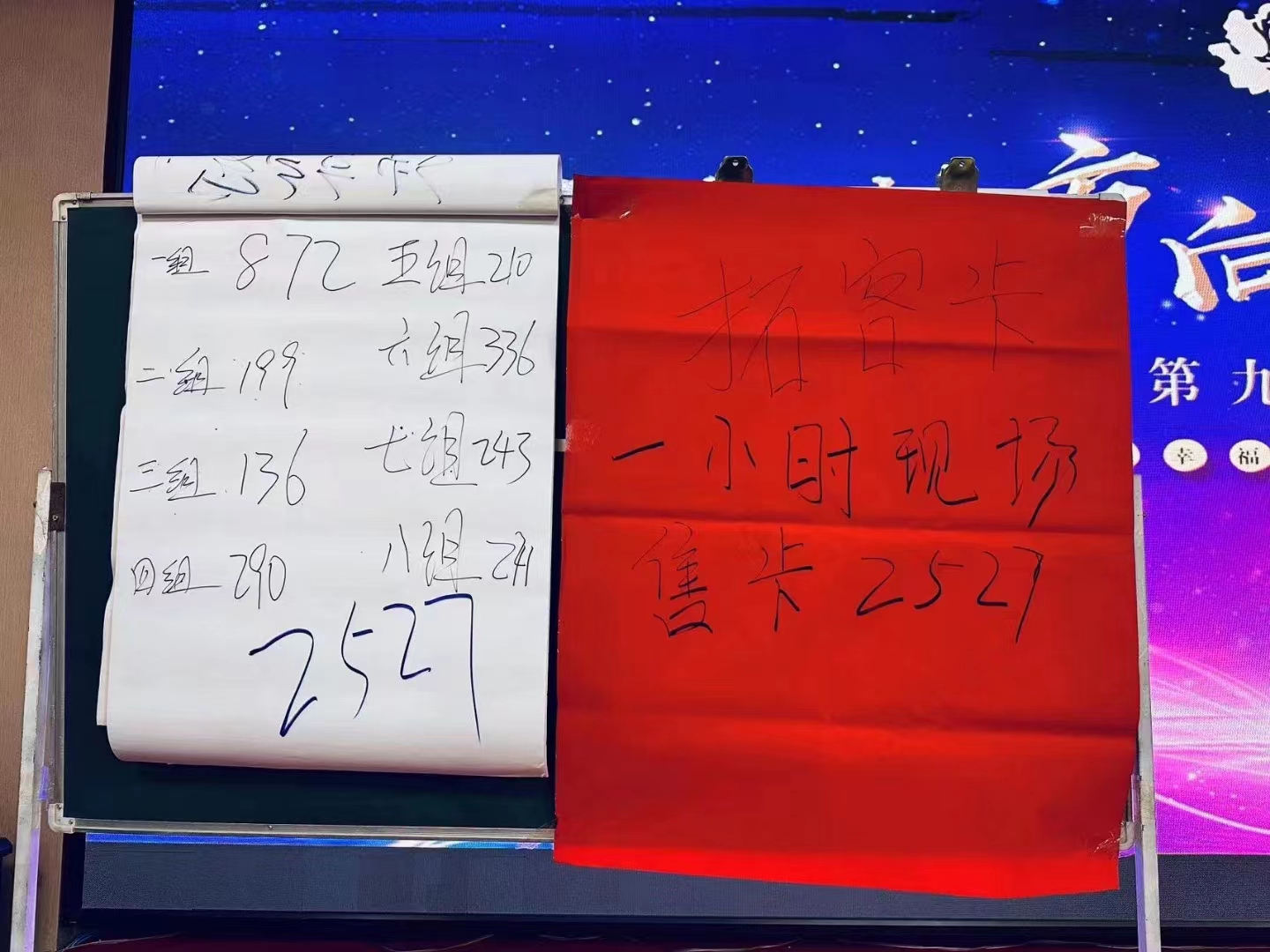 現(xiàn)場一對一教老板和員工線上賣卡PK中,沒有完美的個人,只有完美的團隊,一小時八個小組收獲2527張線上拓客卡。
